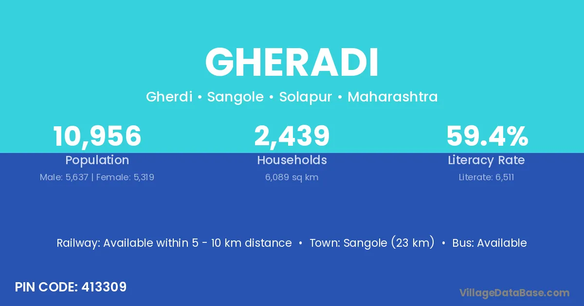 Sangole (23 km) is the nearest town to Gheradi village for major economic activities and is located approximately 23 km away.