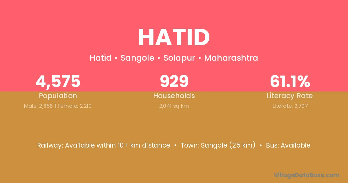 Sangole (25 km) is the nearest town to Hatid village for major economic activities and is located approximately 25 km away.