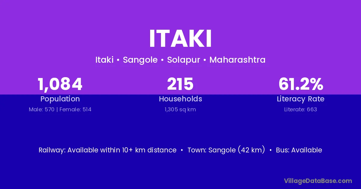 Sangole (42 km) is the nearest town to Itaki village for major economic activities and is located approximately 42 km away.