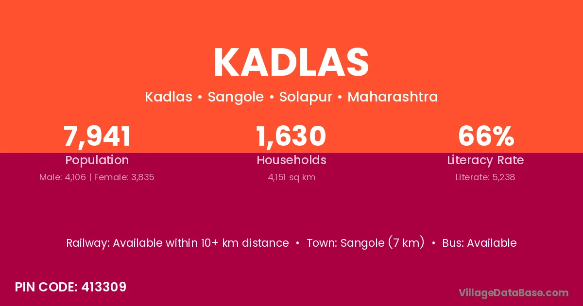 Sangole (7 km) is the nearest town to Kadlas village for major economic activities and is located approximately 7 km away.