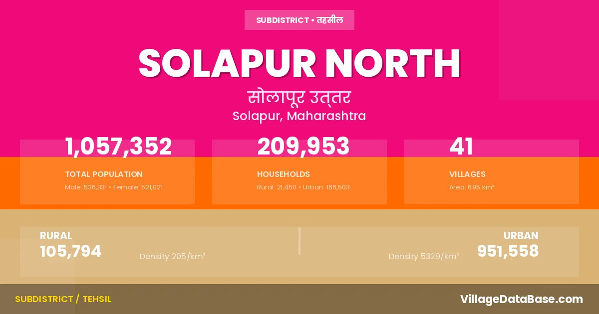 According to the 2011 census The total area of Solapur North Tehsil is 695 km², with a population of 1057352 people. The population density is 1,520 inhabitants per square kilometre, and there are approximately 209953 houses in the sub district.