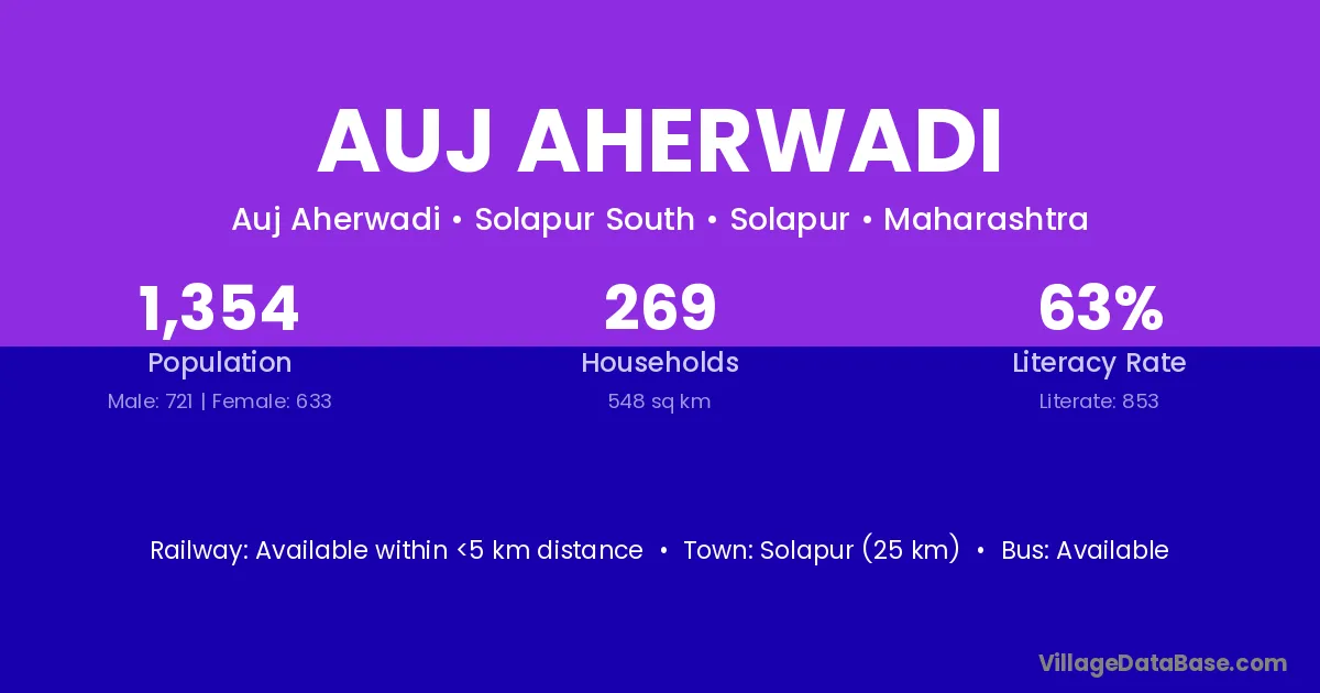 Solapur (25 km) is the nearest town to Auj Aherwadi village for major economic activities and is located approximately 25 km away.