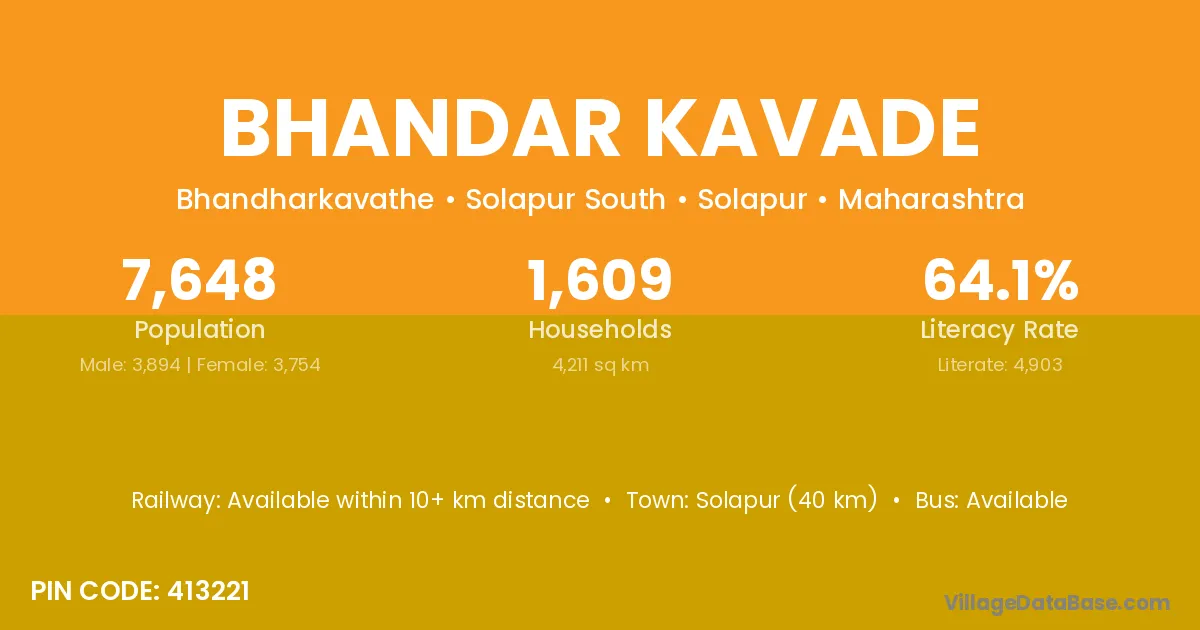 Solapur (40 km) is the nearest town to Bhandar Kavade village for major economic activities and is located approximately 40 km away.