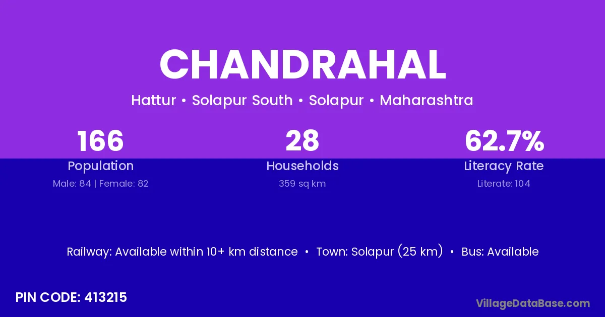 Solapur (25 km) is the nearest town to Chandrahal village for major economic activities and is located approximately 25 km away.