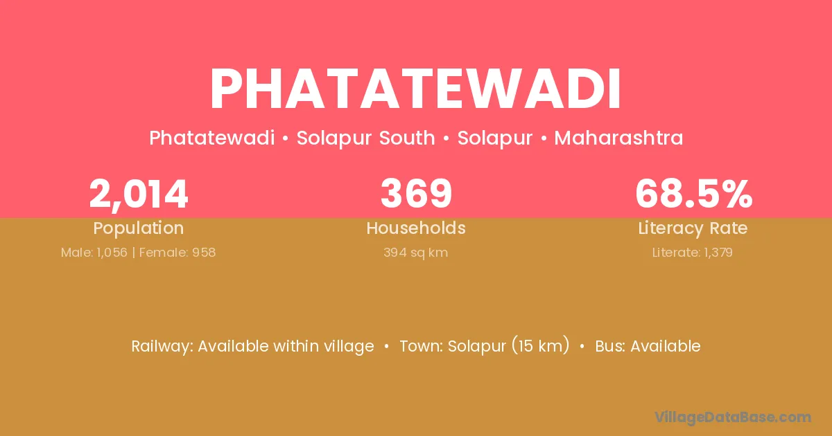 Solapur (15 km) is the nearest town to Phatatewadi village for major economic activities and is located approximately 15 km away.
