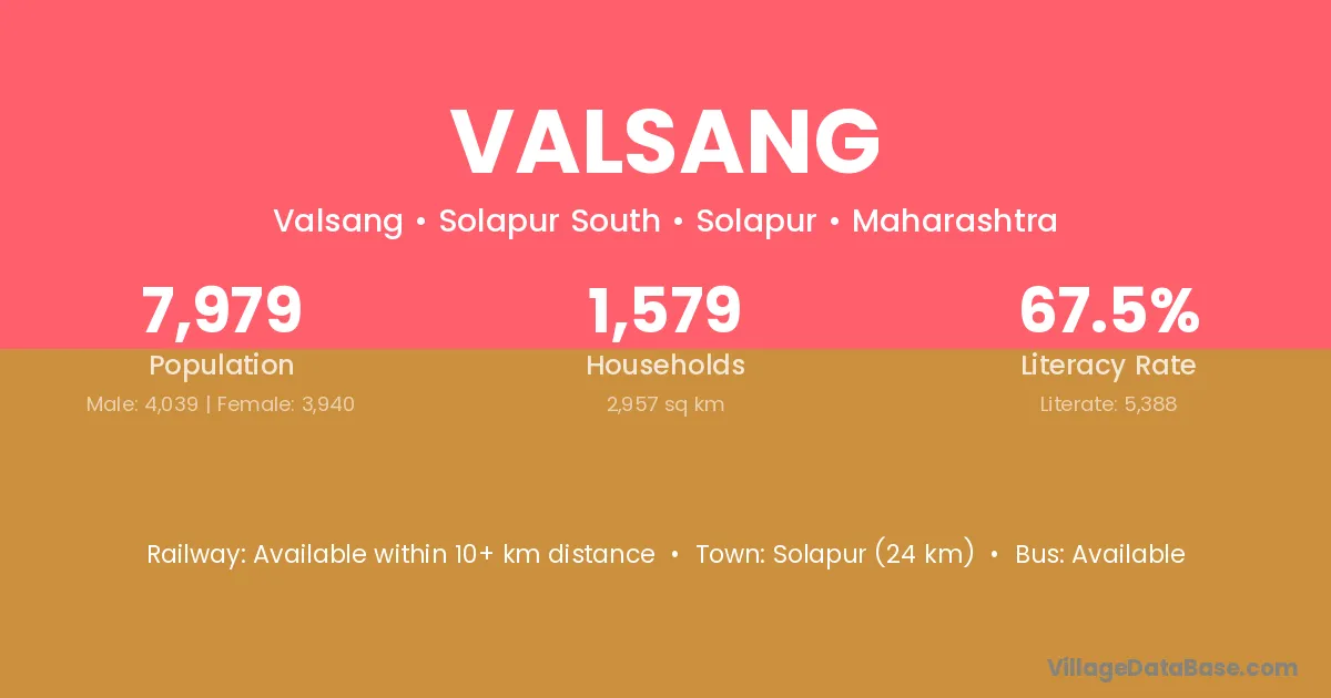 Solapur (24 km) is the nearest town to Valsang village for major economic activities and is located approximately 24 km away.