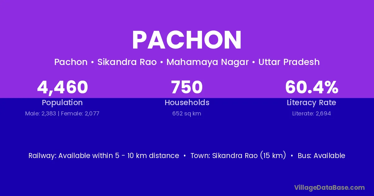 The literacy rate of Pachon village is 54.88%. Male literacy stands at 54.76% and female literacy at 55.00%.