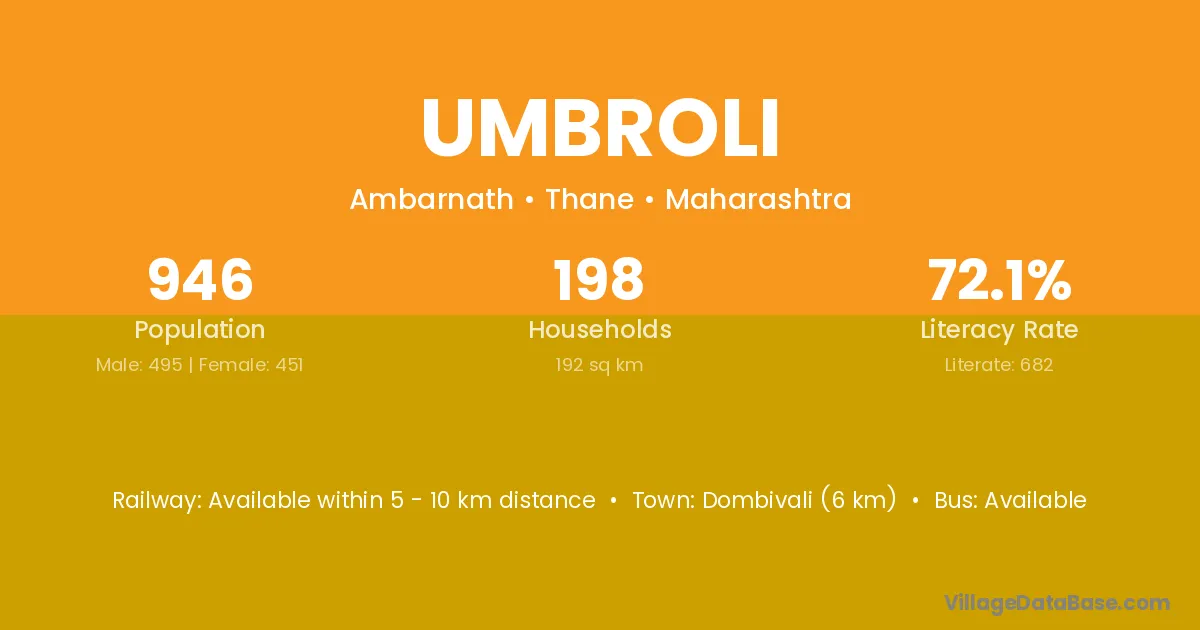 Dombivali (6 km) is the nearest town to Umbroli village for major economic activities and is located approximately 6 km away.