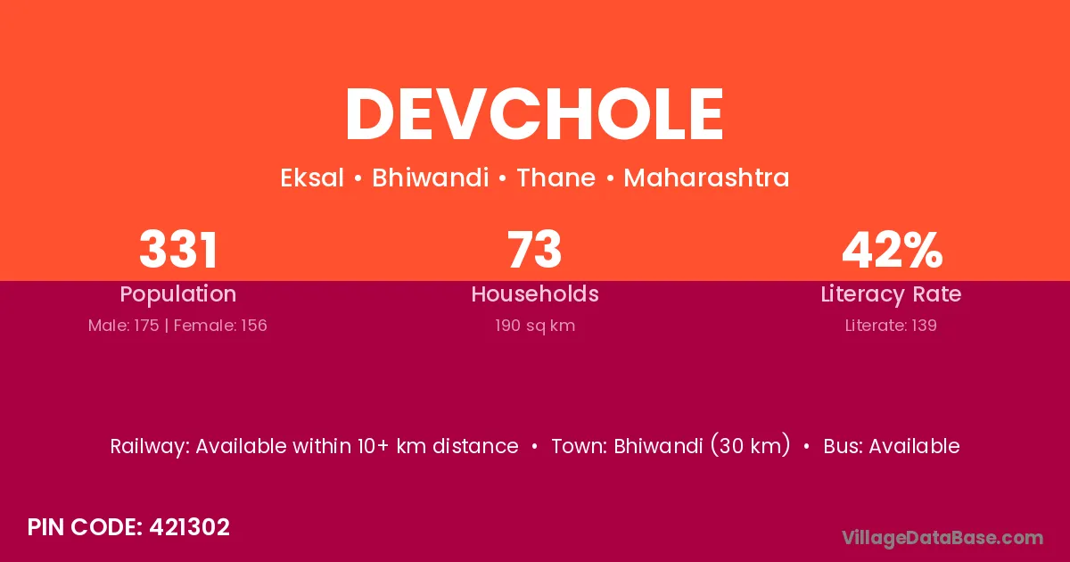 Bhiwandi (30 km) is the nearest town to Devchole village for major economic activities and is located approximately 30 km away.