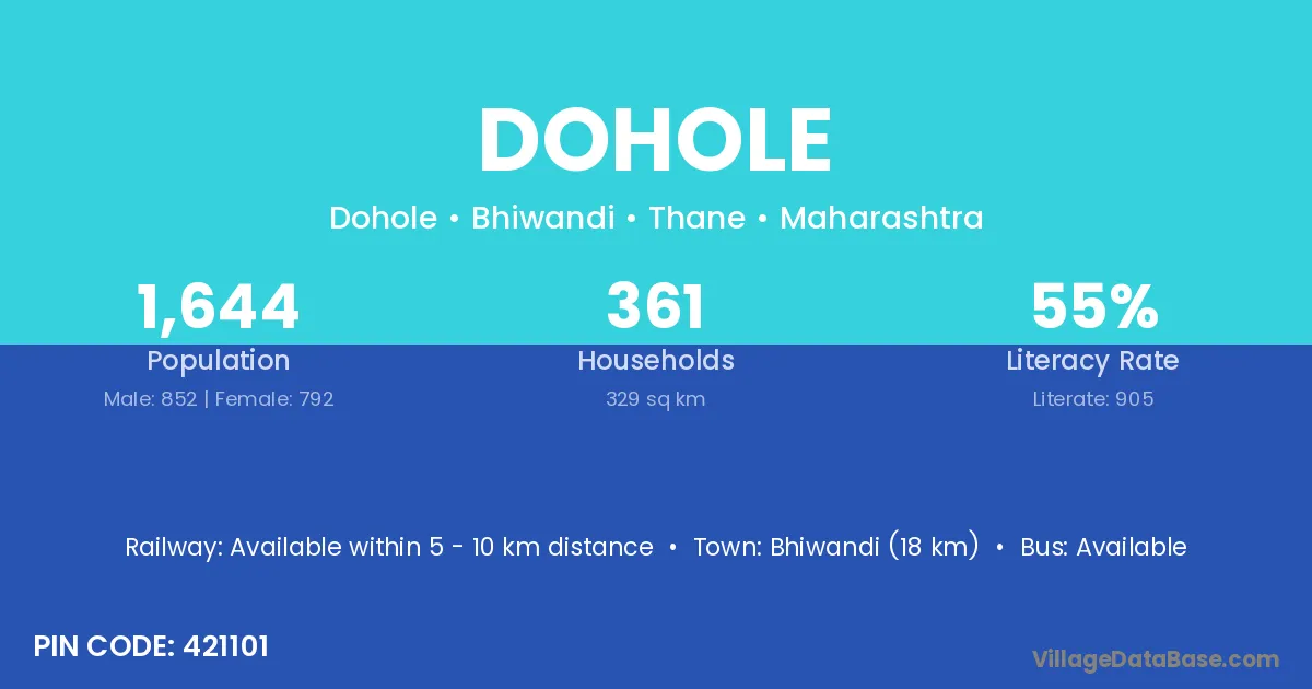 Bhiwandi (18 km) is the nearest town to Dohole village for major economic activities and is located approximately 18 km away.