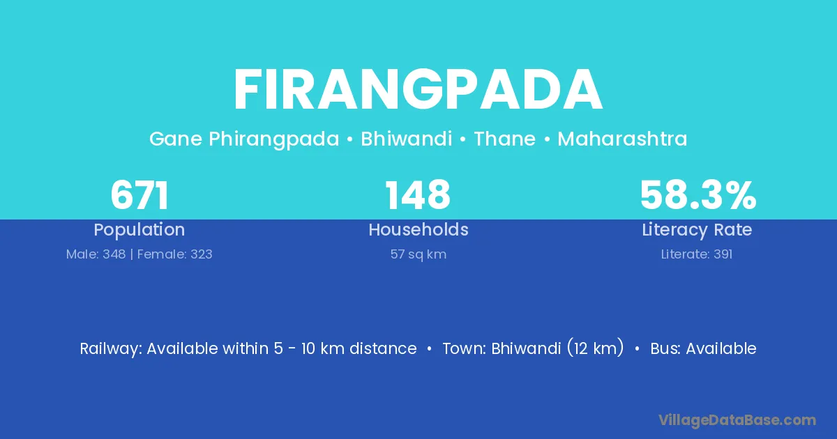 Bhiwandi (12 km) is the nearest town to Firangpada village for major economic activities and is located approximately 12 km away.