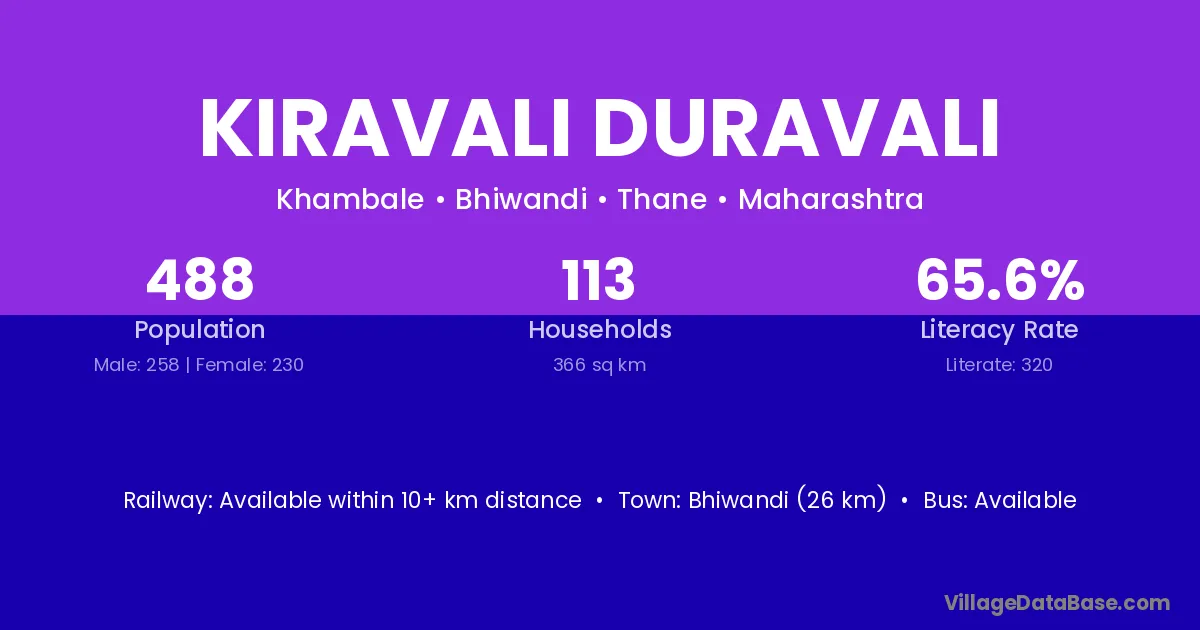Bhiwandi (26 km) is the nearest town to Kiravali Duravali village for major economic activities and is located approximately 26 km away.