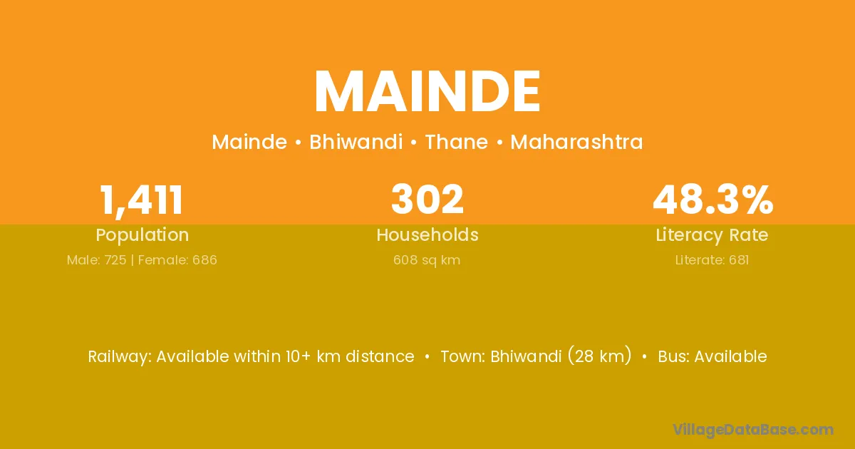 Bhiwandi (28 km) is the nearest town to Mainde village for major economic activities and is located approximately 28 km away.