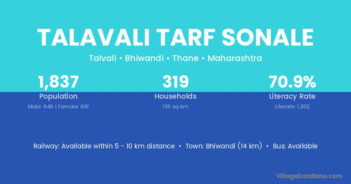 Talavali Tarf Sonale village has a total population of 1,837 people, of which 946 are males and 891 are females.