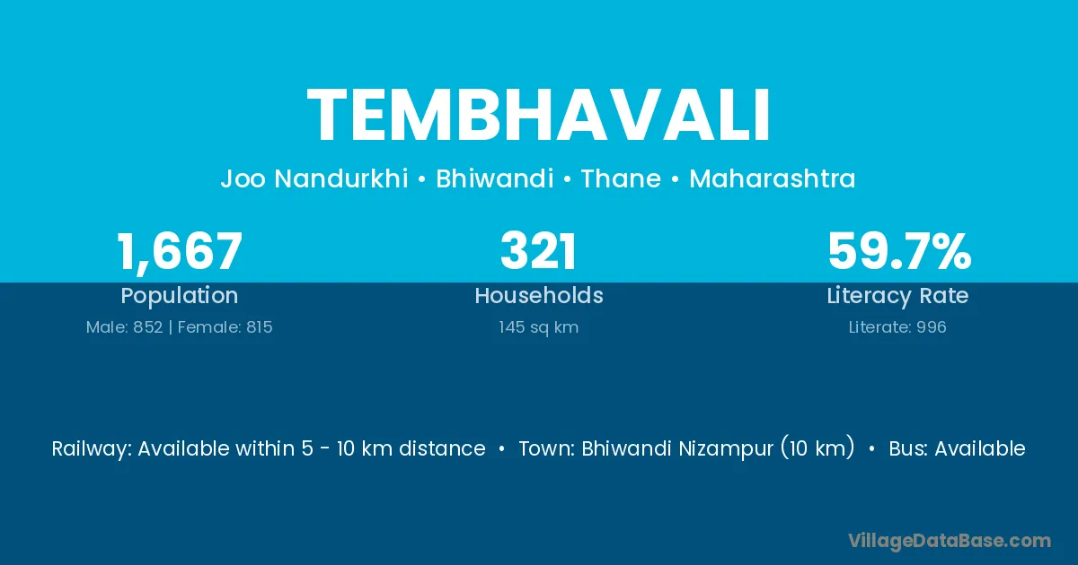 Bhiwandi Nizampur (10 km) is the nearest town to Tembhavali village for major economic activities and is located approximately 10 km away.