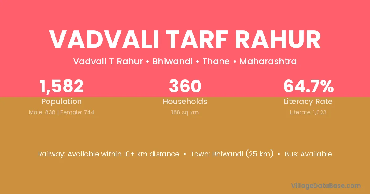 Bhiwandi (25 km) is the nearest town to Vadvali Tarf Rahur village for major economic activities and is located approximately 25 km away.