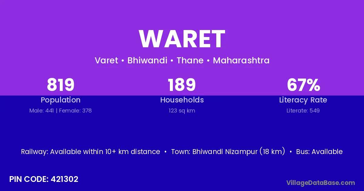 Bhiwandi Nizampur (18 km) is the nearest town to Waret village for major economic activities and is located approximately 18 km away.