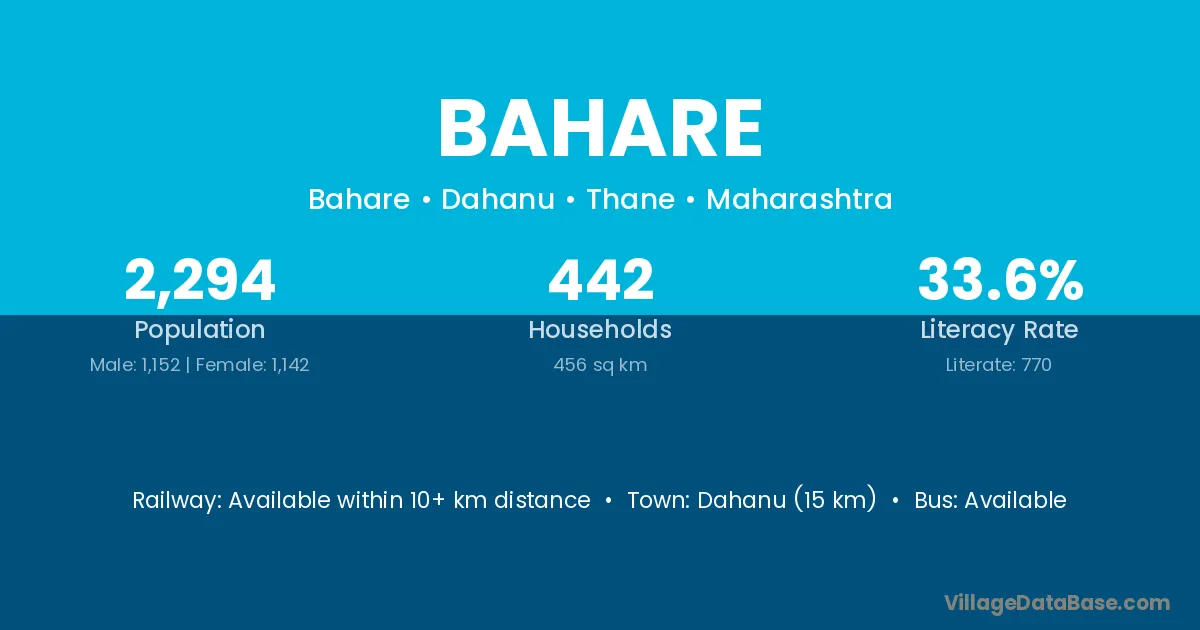 Dahanu (15 km) is the nearest town to Bahare village for major economic activities and is located approximately 15 km away.