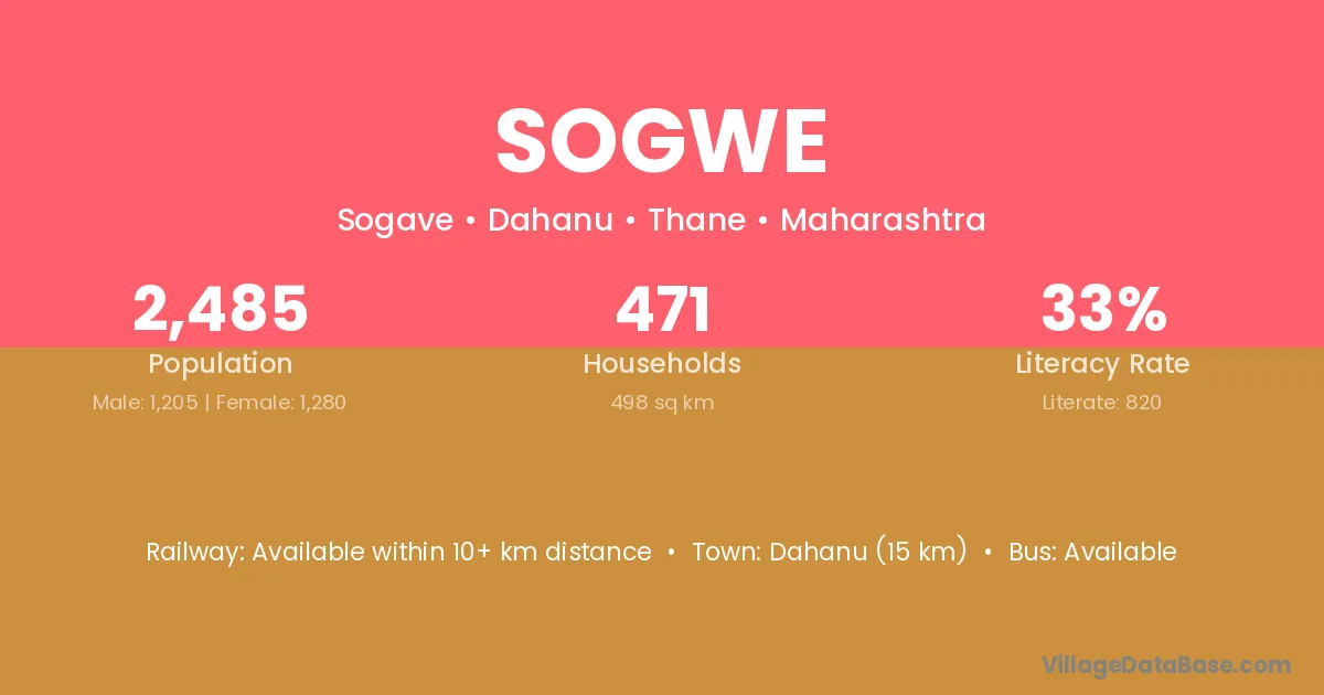 Dahanu (15 km) is the nearest town to Sogwe village for major economic activities and is located approximately 15 km away.