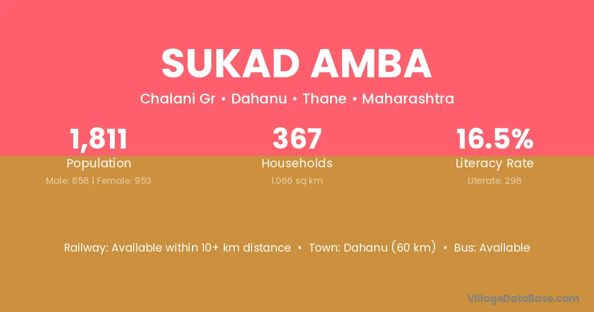 Dahanu (60 km) is the nearest town to Sukad Amba village for major economic activities and is located approximately 60 km away.