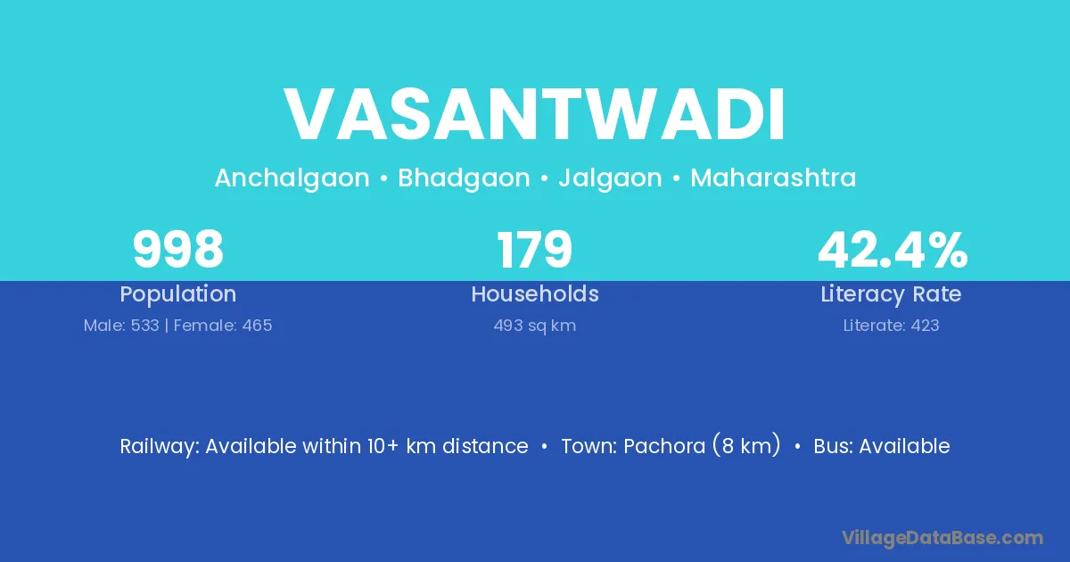 The literacy rate of Vasantwadi village is 33.55%. Male literacy stands at 44.10% and female literacy at 23.78%.