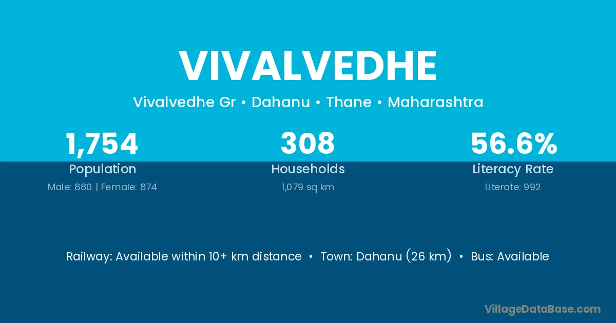 Dahanu (26 km) is the nearest town to Vivalvedhe village for major economic activities and is located approximately 26 km away.
