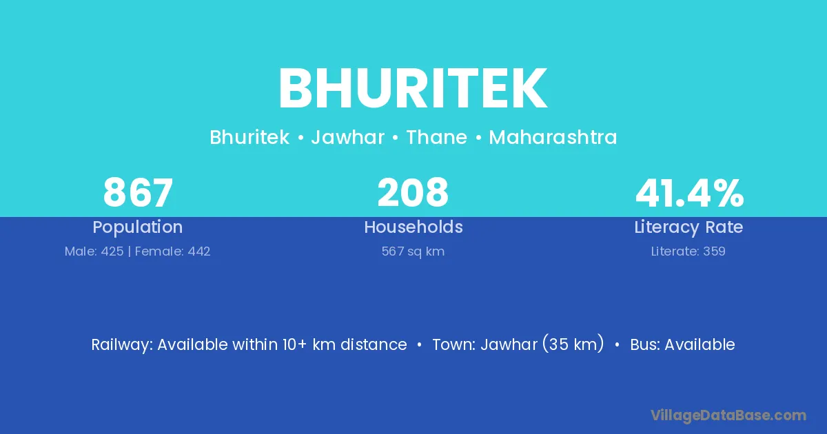 Jawhar (35 km) is the nearest town to Bhuritek village for major economic activities and is located approximately 35 km away.