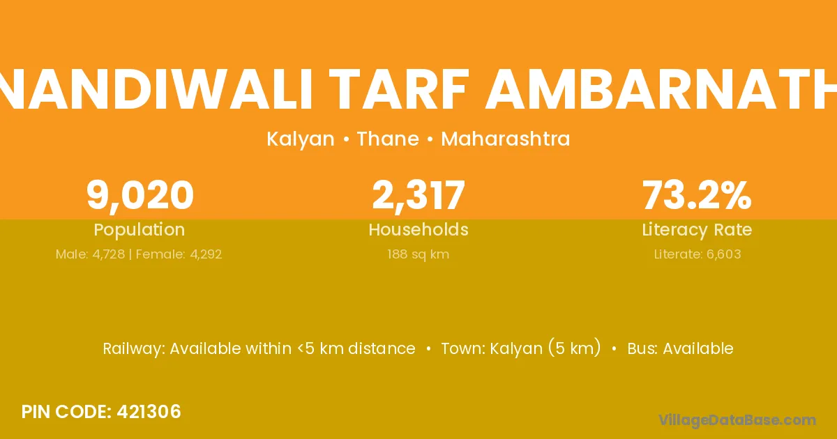 Nandiwali Tarf Ambarnath village has a total population of 9,020 people, of which 4,728 are males and 4,292 are females.