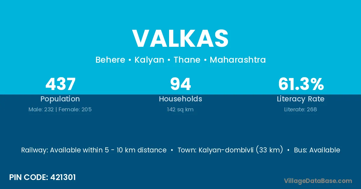 Kalyan-dombivli (33 km) is the nearest town to Valkas village for major economic activities and is located approximately 33 km away.