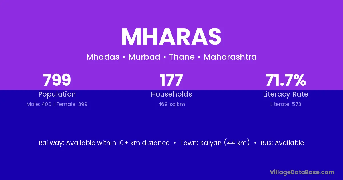Kalyan (44 km) is the nearest town to Mharas village for major economic activities and is located approximately 44 km away.