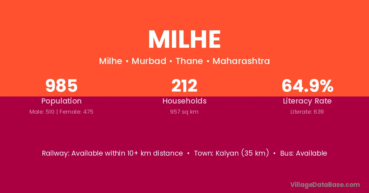 Kalyan (35 km) is the nearest town to Milhe village for major economic activities and is located approximately 35 km away.