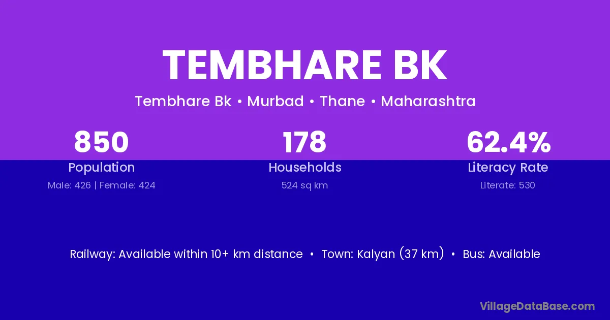 Tembhare Bk village has a total population of 850 people, of which 426 are males and 424 are females.