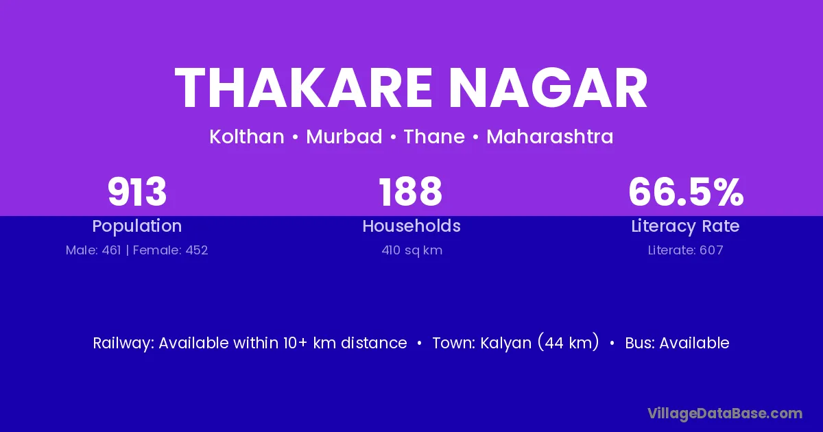 Kalyan (44 km) is the nearest town to Thakare Nagar village for major economic activities and is located approximately 44 km away.