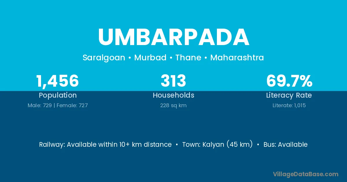 Kalyan (45 km) is the nearest town to Umbarpada village for major economic activities and is located approximately 45 km away.