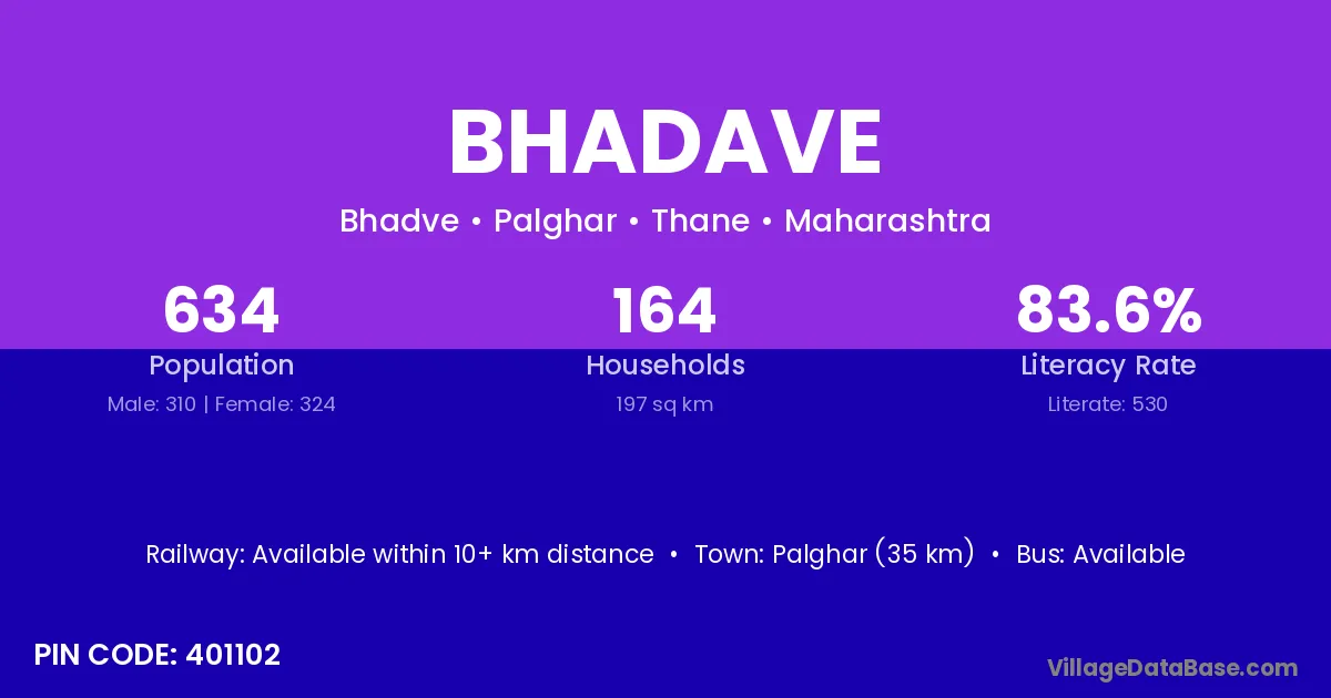 Palghar (35 km) is the nearest town to Bhadave village for major economic activities and is located approximately 35 km away.
