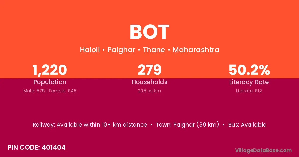 Palghar (39 km) is the nearest town to Bot village for major economic activities and is located approximately 39 km away.
