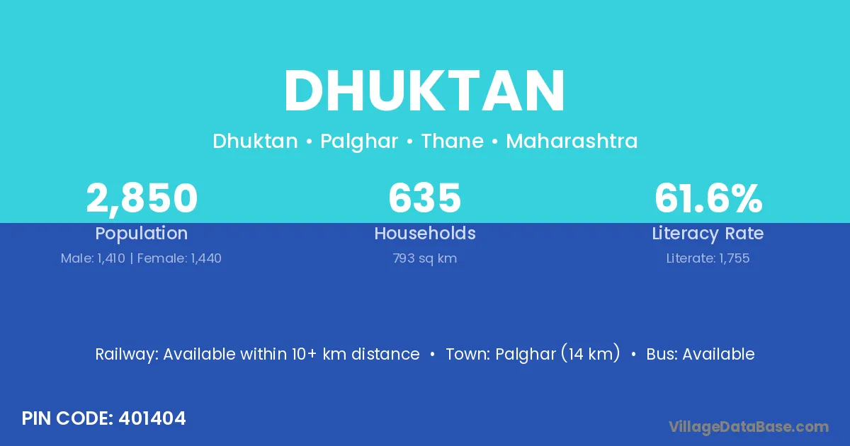 Palghar (14 km) is the nearest town to Dhuktan village for major economic activities and is located approximately 14 km away.