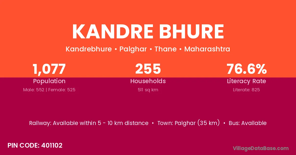 Palghar (35 km) is the nearest town to Kandre Bhure village for major economic activities and is located approximately 35 km away.