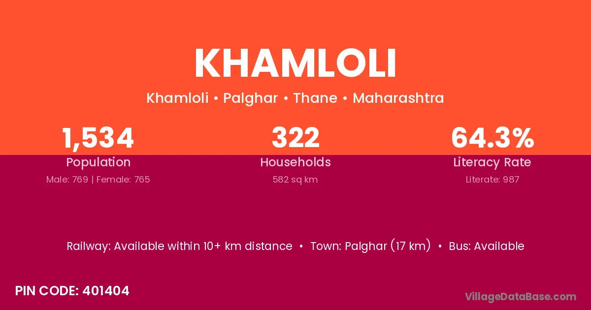 Palghar (17 km) is the nearest town to Khamloli village for major economic activities and is located approximately 17 km away.