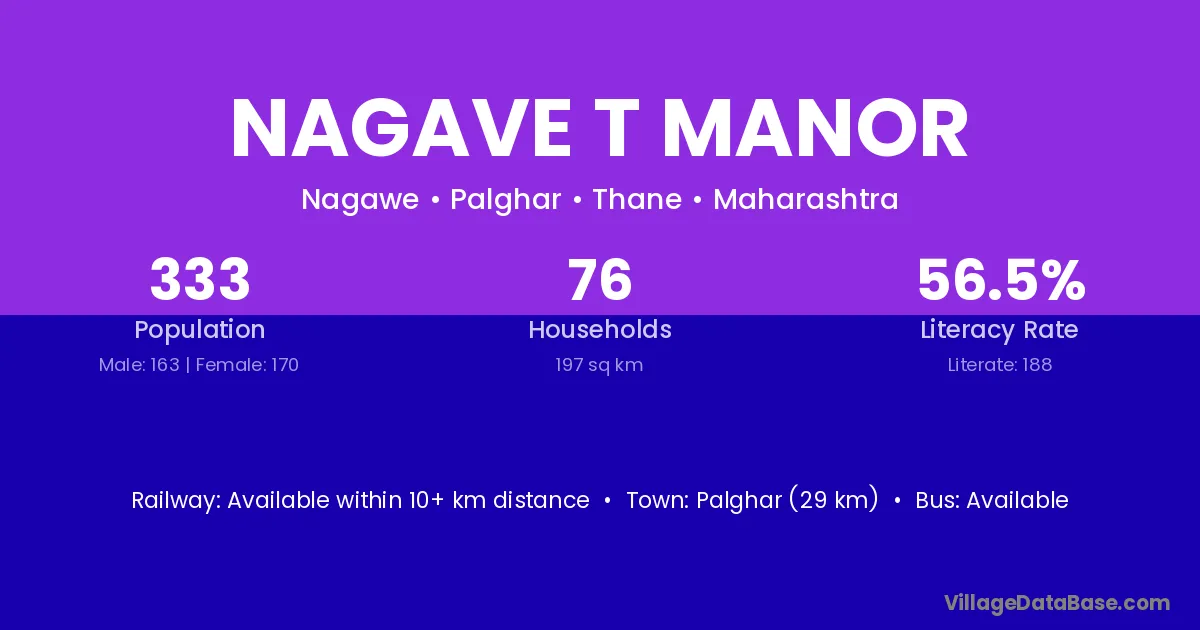 Palghar (29 km) is the nearest town to Nagave T Manor village for major economic activities and is located approximately 29 km away.