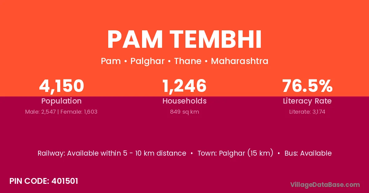 Palghar (15 km) is the nearest town to Pam Tembhi village for major economic activities and is located approximately 15 km away.