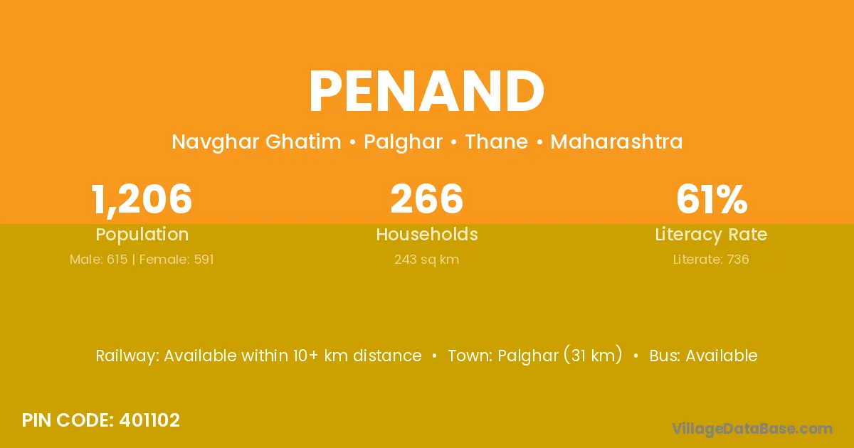 Palghar (31 km) is the nearest town to Penand village for major economic activities and is located approximately 31 km away.