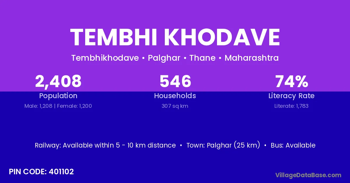 Palghar (25 km) is the nearest town to Tembhi Khodave village for major economic activities and is located approximately 25 km away.