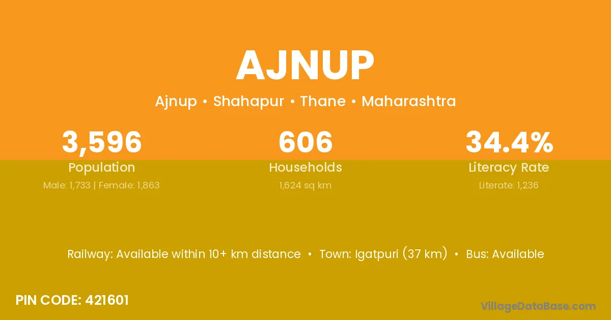 Igatpuri (37 km) is the nearest town to Ajnup village for major economic activities and is located approximately 37 km away.