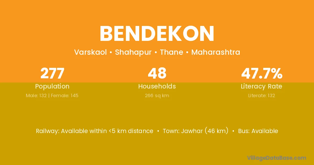 Jawhar (46 km) is the nearest town to Bendekon village for major economic activities and is located approximately 46 km away.