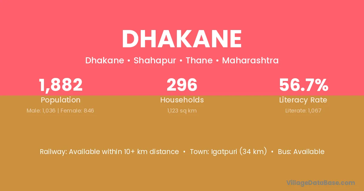 Igatpuri (34 km) is the nearest town to Dhakane village for major economic activities and is located approximately 34 km away.