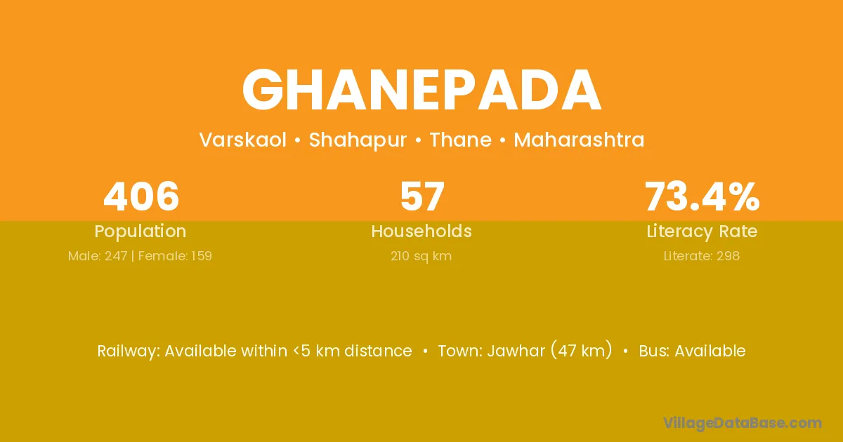 Jawhar (47 km) is the nearest town to Ghanepada village for major economic activities and is located approximately 47 km away.