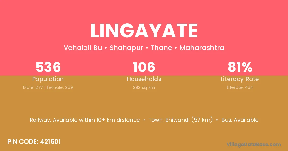 Bhiwandi (57 km) is the nearest town to Lingayate village for major economic activities and is located approximately 57 km away.