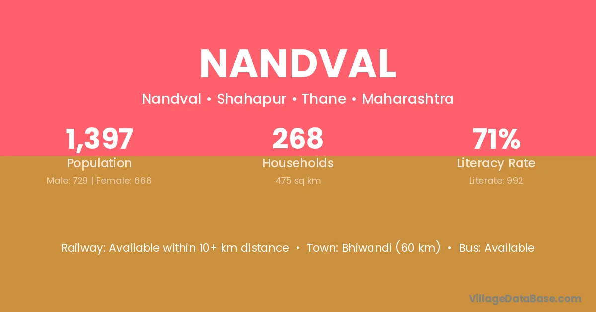 Bhiwandi (60 km) is the nearest town to Nandval village for major economic activities and is located approximately 60 km away.