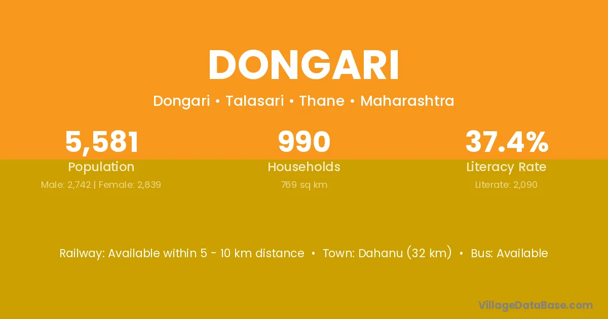 Dahanu (32 km) is the nearest town to Dongari village for major economic activities and is located approximately 32 km away.